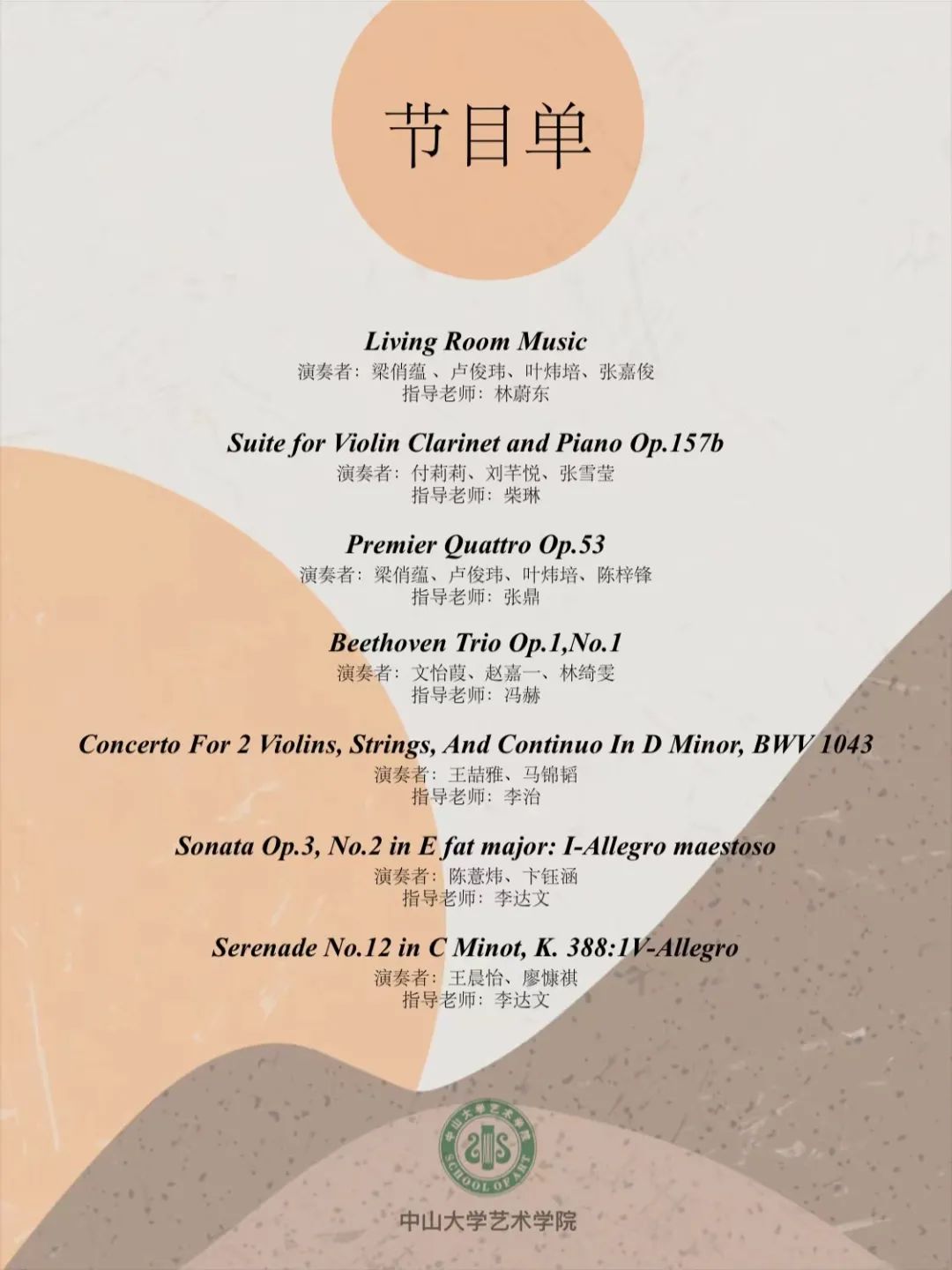 导航痕迹 中山大学艺术学院 学生工作 高水平艺术团 预告 | 中山大学艺术学院室内乐音乐会 扫描此二维码分享 预告 | 中山大学艺术学院室内乐音乐会 发布人:胡中龙 责任审核人:金婷婷 系统审核人:吴晓枫 发布日期:2021-12-07