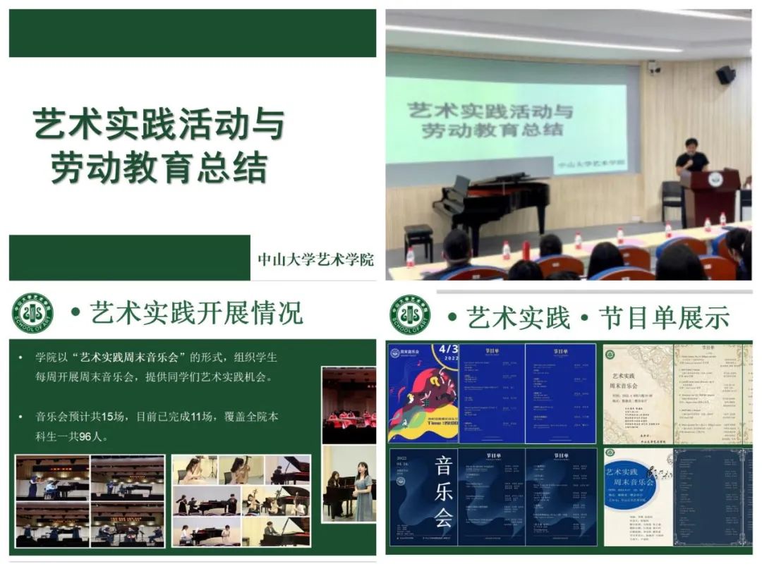 随后,青年教师专职辅导员张海庆老师总结了我院劳动教育与艺术实践活动开展情况。本学期劳动教育课程内容丰富,帮助同学们树立正确的劳动观念,养成良好的劳动习惯。学院将劳动教育与美育相融合,已常态化举办11场艺术实践周末音乐会。所有音乐会均由学生负责海报设计、现场彩排、后台调度、舞台导领、摄影摄像,在为学生提供真实专业的舞台实践机会的同时,让学生自觉掌握专业劳动技能,提高在生产实践中发现问题和创造性解决问题的能力。