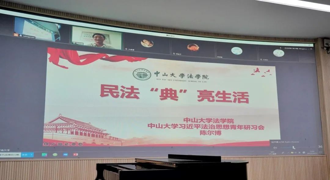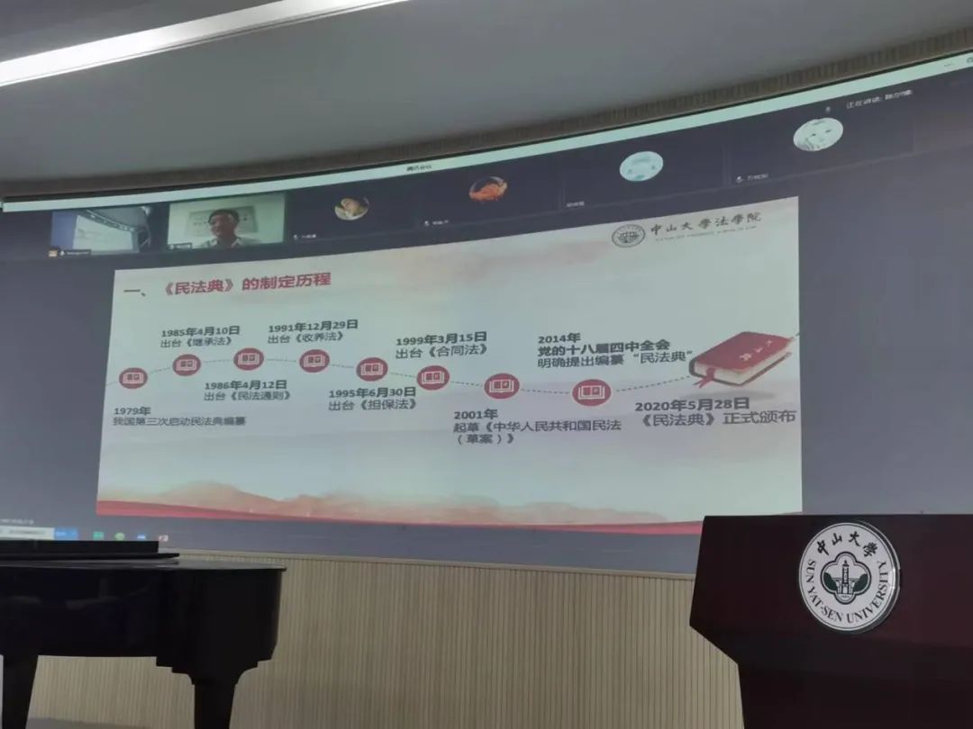 接着,中山大学法学院在读博士研究生陈尔博同学在线向同学们交流了习近平法治思想内容,并详细介绍了《民法典》制定历程。通过学习,同学们了解了《民法典》坚持主体平等、保护财产权利、便利交易流转、维护人格尊严、促进家庭和谐、追究侵权责任的基本要求,更加深刻的感受到《民法典》的颁布实施是中国特色社会主义法律体系的重要支柱,为实现百年奋斗目标,提供了坚实的法治保障。
