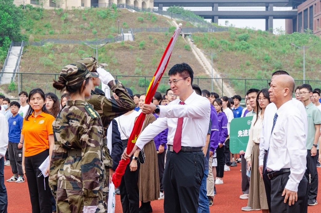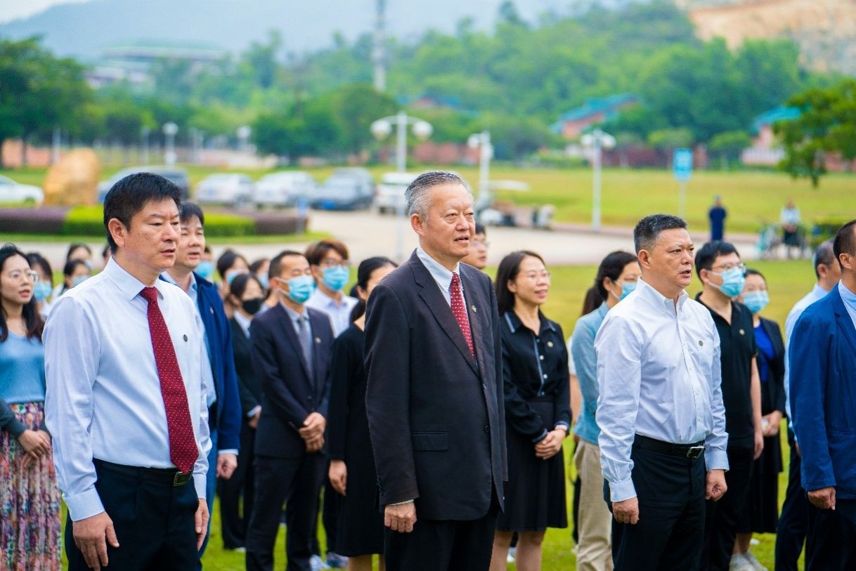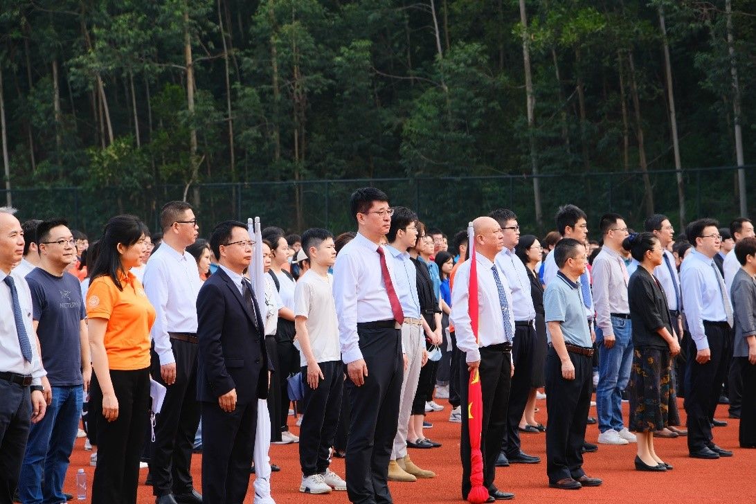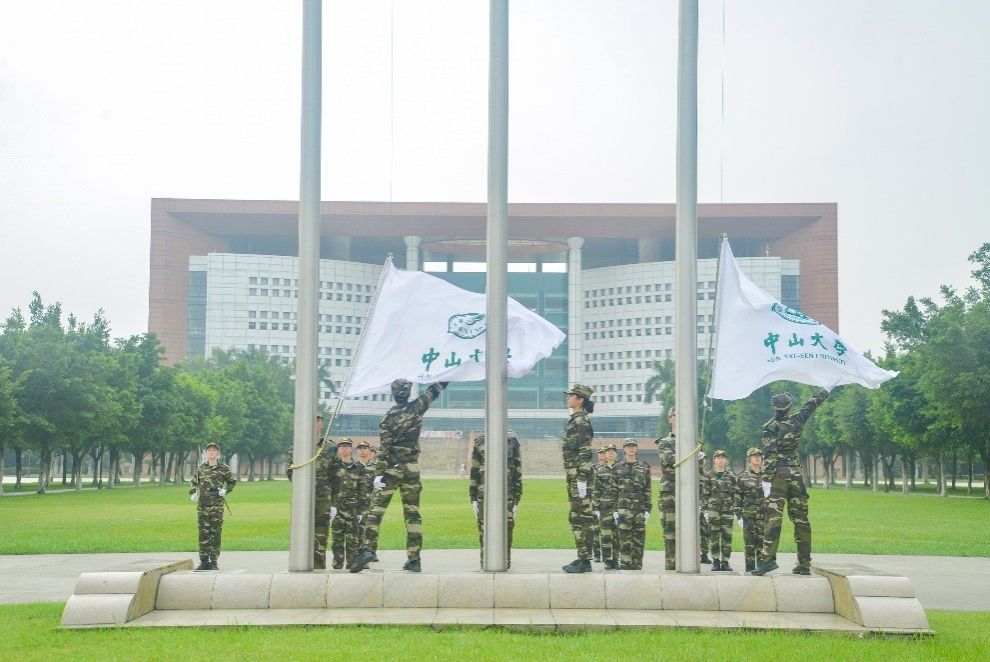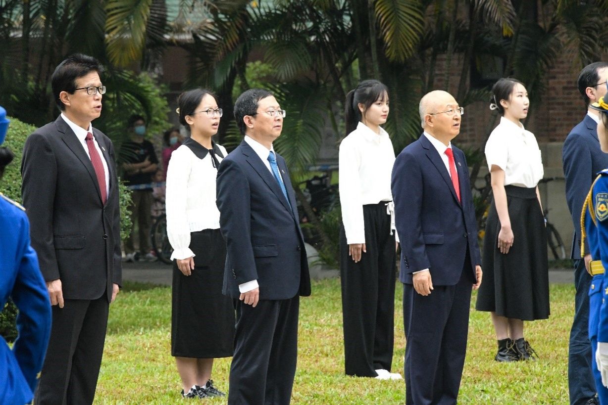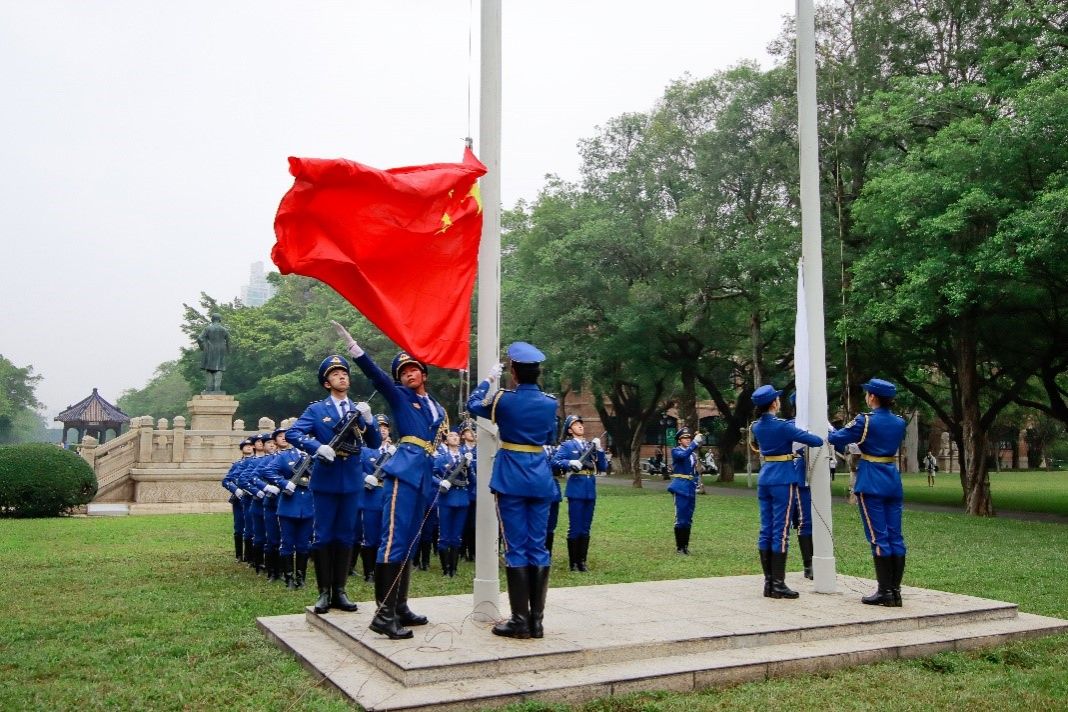 在国歌、校歌声中,五星红旗和中山大学校旗相继冉冉升起、迎风飘扬,全体人员行注目礼,现场氛围庄严肃穆。