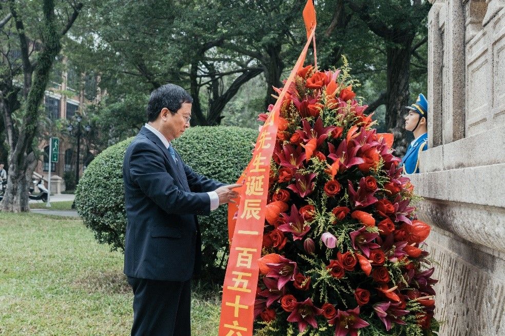 广州校区三个校园和珠海校区分别举行了向孙中山先生铜像献花仪式。随着敬献花篮曲响起,国旗班代表将花篮稳步抬至孙中山先生铜像基座前。主礼校领导缓步上前,仔细整理花篮缎带。“纪念孙中山先生诞辰一百五十六周年”的烫金字体映在红色缎带上格外显眼,静静诉说着中大人对中山先生的深切缅怀和崇高敬意。