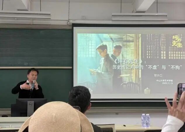 11月13日,中山大学艺术学院举办了《坪石先生:历史传记片中的“不虚”与“不拘”》专题讲座。本次讲座由华南师范大学电影创作研究中心主任甘小二教授主讲,艺术学院蒋晶教授主持。本次讲座基于甘小二教授在编导演电影《坪石先生》时的经历和思考,针对历史传记片叙事与历史记载之间的张力与取舍问题做了分享,从实践出发,指出历史传记片要在重要时间节点上“不虚”,在反映人物精神性的情节上则可以“不拘”,为历史题材电影的创作提供了有价值的参考。